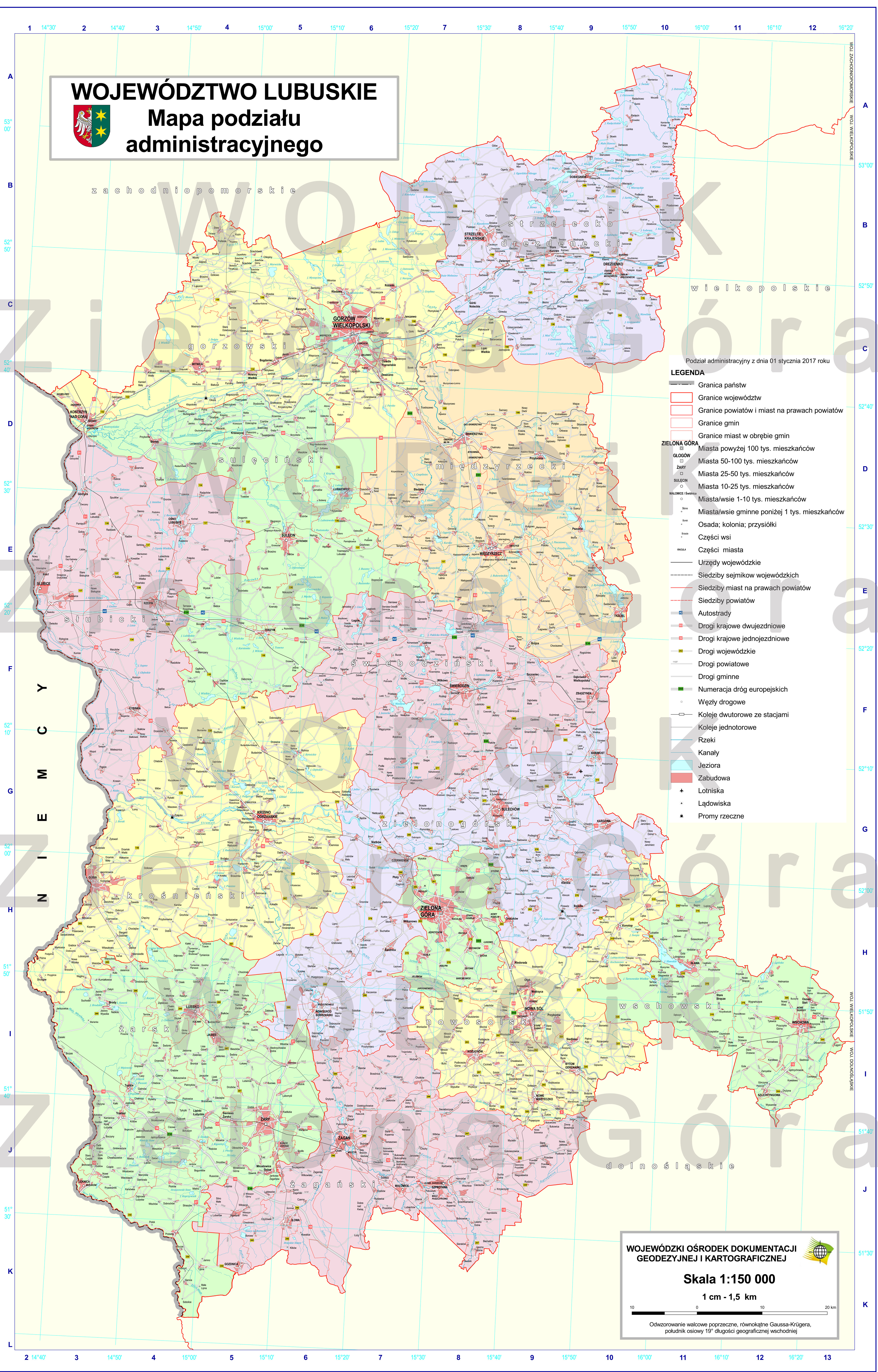 W wojewódzkim zasobie geodezyjnym i kartograficznym znajduje się: mapa administracyjna oraz mapa administracyjno-drogowa województwa lubuskiego opracowane przez WODGiK Zielona Góra. Mapa w skali 1:150 000 przedstawia aktualny podział administracyjny województwa, sieć osadniczą, sieć dróg (z numeracją). Aktualność mapy 1.01.2018 r.